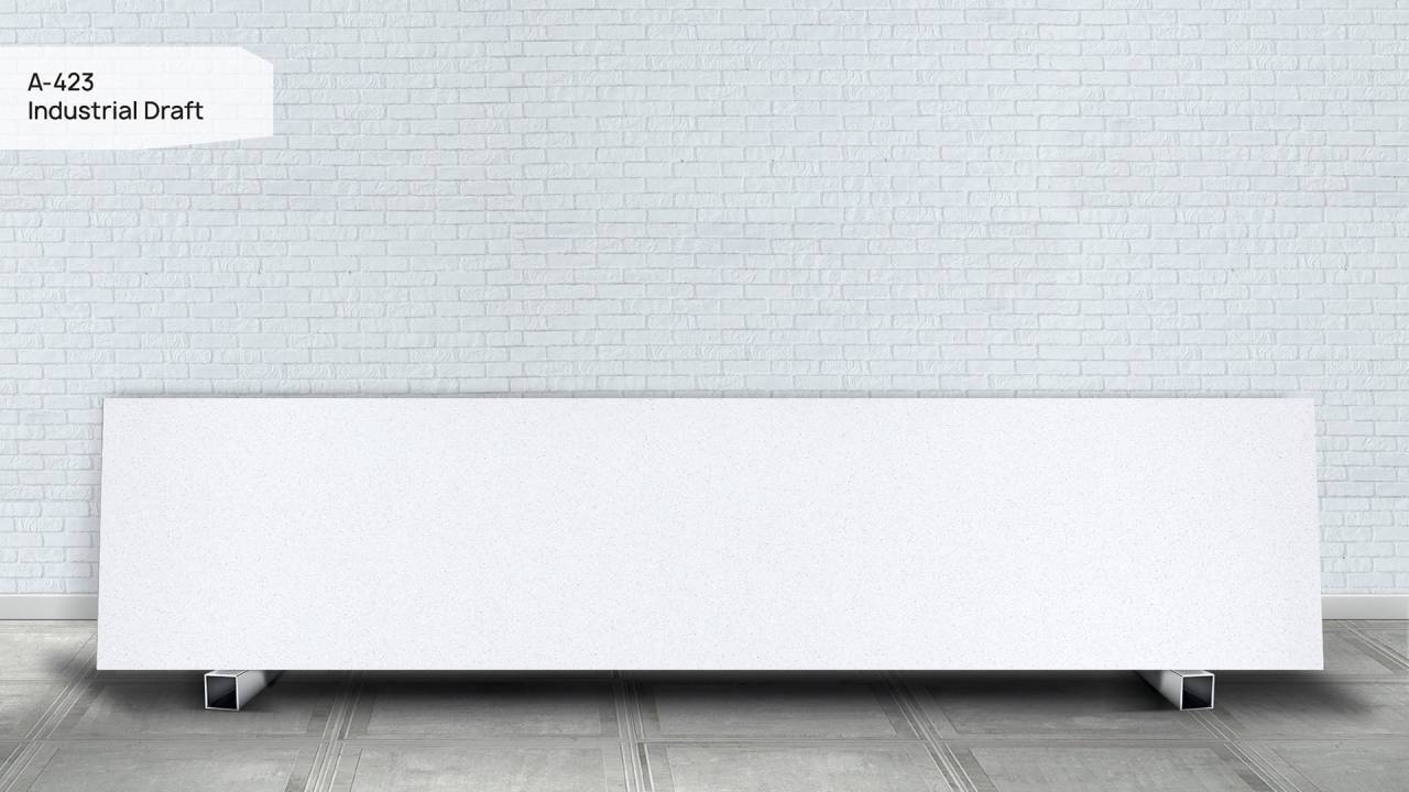 Холодный светло-серый фон с разнотональной крапинкой — беспроигрышный выбор для кухонь, где нужна поверхность, которая «не мешает» остальному интерьеру. A423 одинаково хорошо работает: