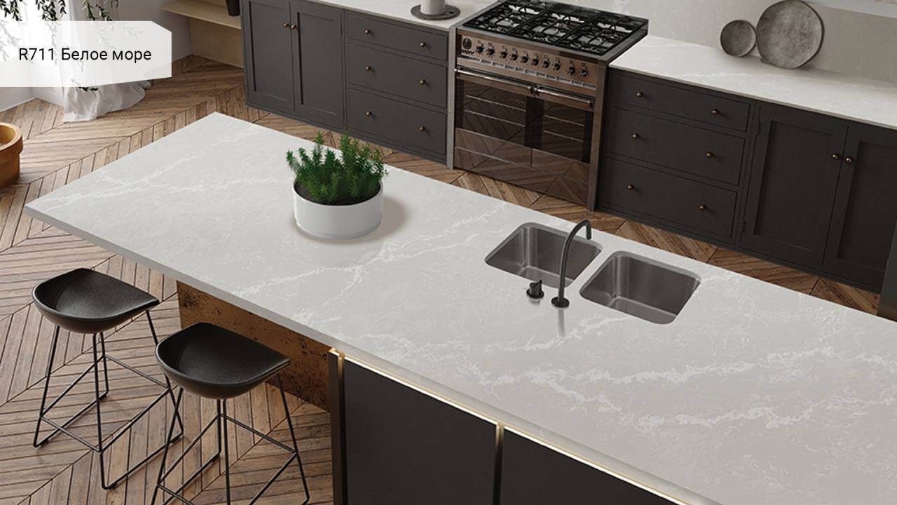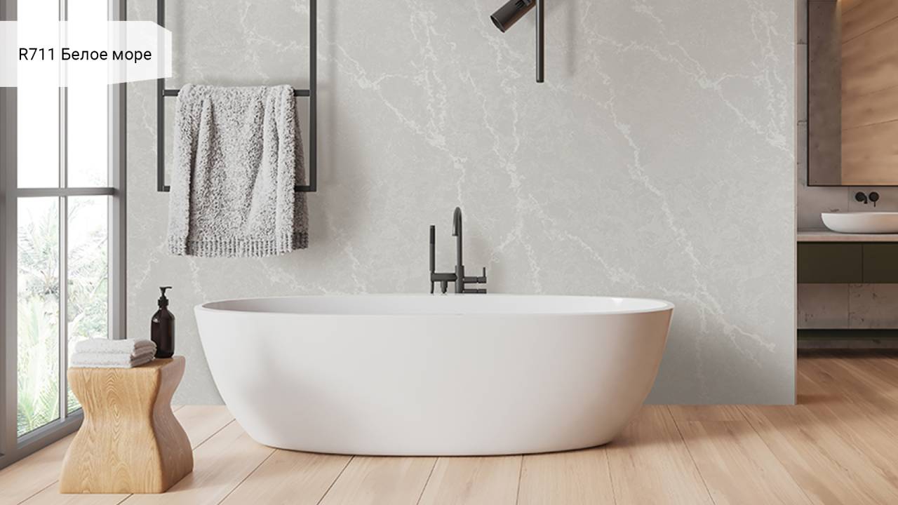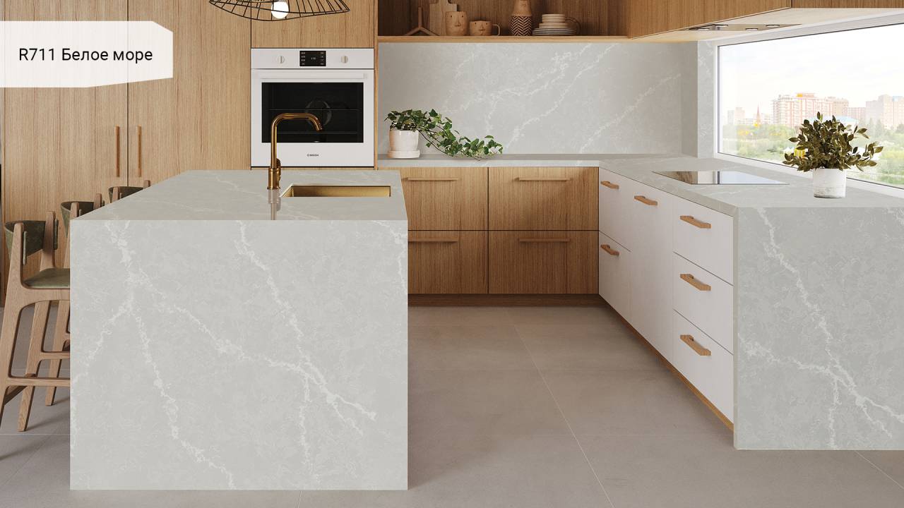 Кварцевый агломерат Аварус RM711 "Белое Море" - это изысканное сочетание качественных материалов и элегантного дизайна, которое придаст вашему интерьеру неповторимый шарм и изысканность. Этот материал отличается высокой прочностью, стойкостью к механическим повреждениям и влаге, что делает его идеальным выбором для отделки кухонных столешниц, ванн, оконных подоконников и других поверхностей.