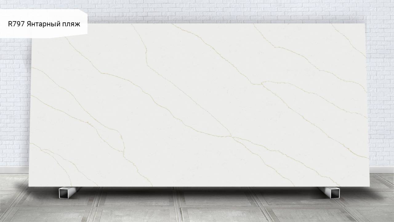 Буква «M» в артикуле RM797 означает матовую финишную обработку. В отличие от глянцевой версии R797, матовая поверхность не бликует, на ней меньше заметны отпечатки пальцев и мелкие следы от воды. Мы часто рекомендуем матовый кварц для кухонных столешниц — в ежедневном использовании он практичнее глянца.