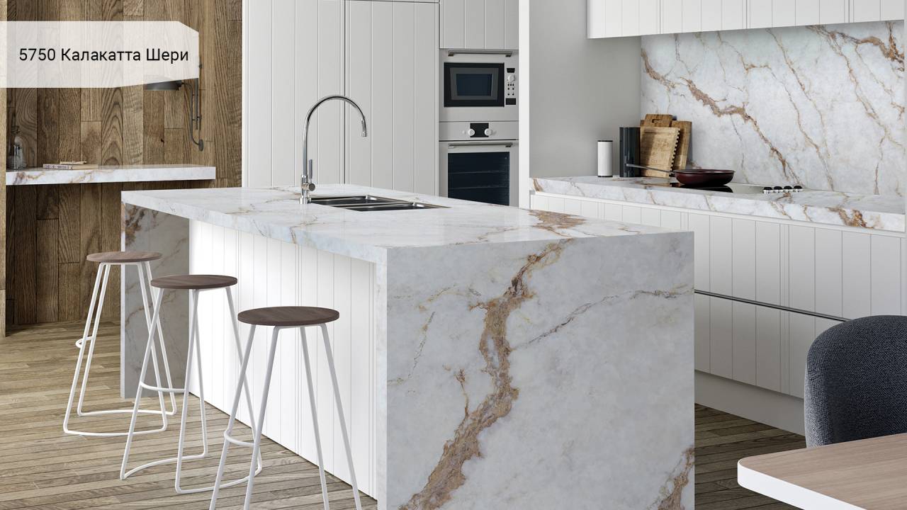 Кварцевый агломерат Avant Quartz 5750 Калакатта Шери — белый с изысканными мраморными прожилками. Материал на 93% состоит из природного кварца, что обеспечивает исключительную твёрдость и долговечность поверхности.