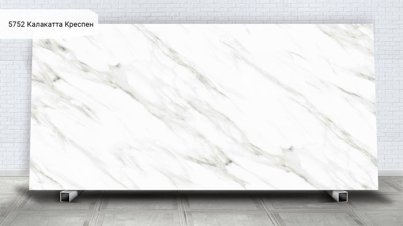 Кварцевый агломерат Avant Quartz 5752 Калакатта Креспен — белый с изысканными мраморными прожилками. Материал на 93% состоит из природного кварца, что обеспечивает исключительную твёрдость и долговечность поверхности.
