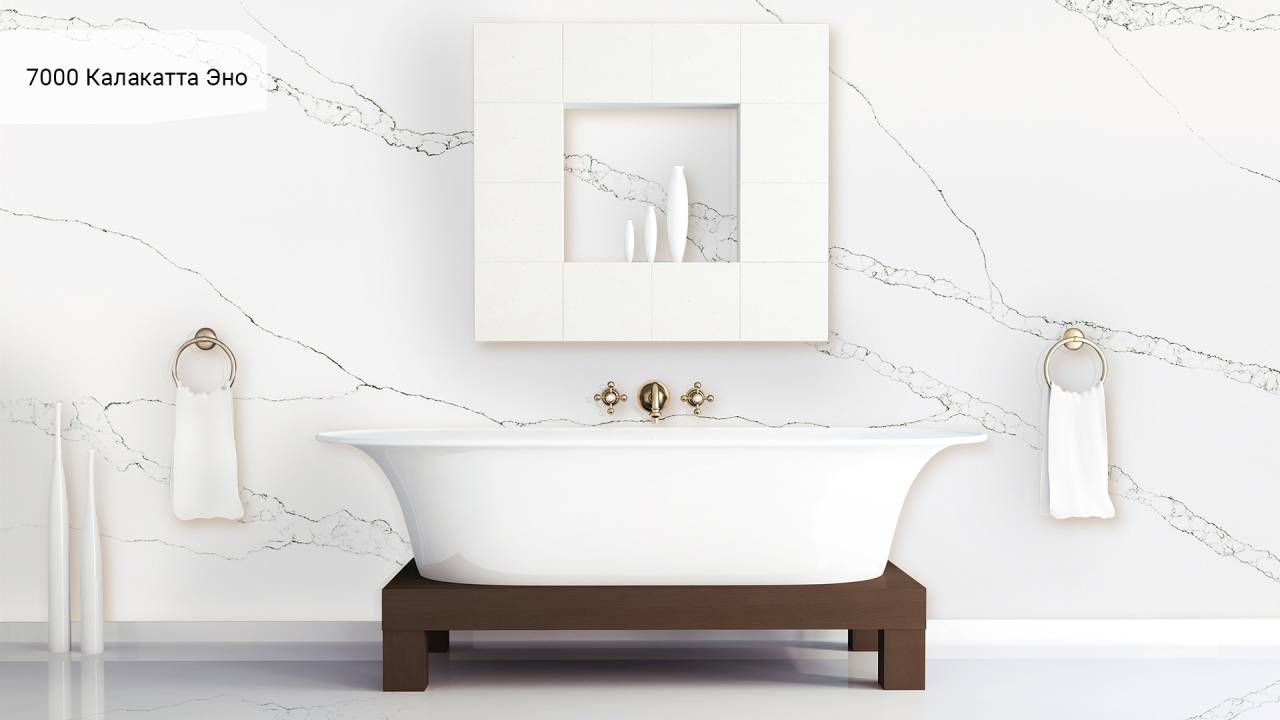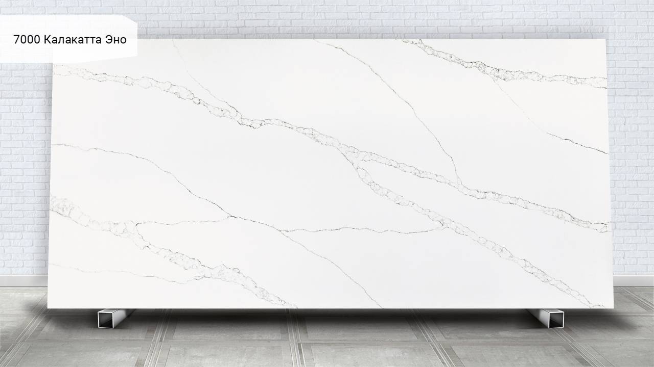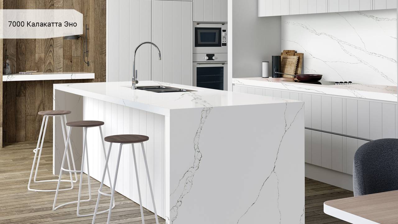 Кварцевый агломерат Avant Quartz 7000 Калакатта Эно — белый с изысканными мраморными прожилками. Материал на 93% состоит из природного кварца, что обеспечивает исключительную твёрдость и долговечность поверхности.