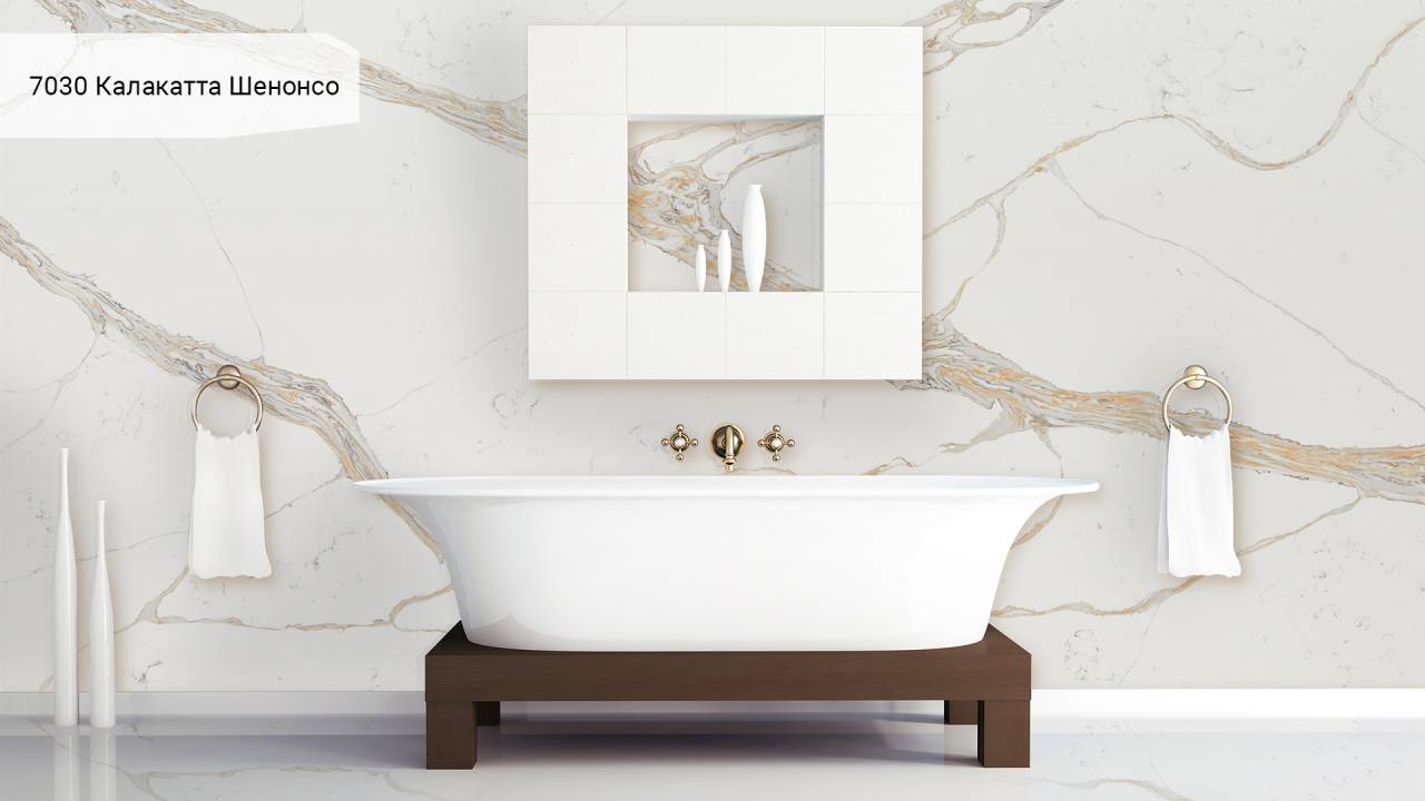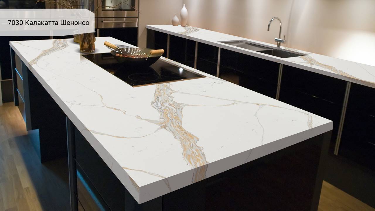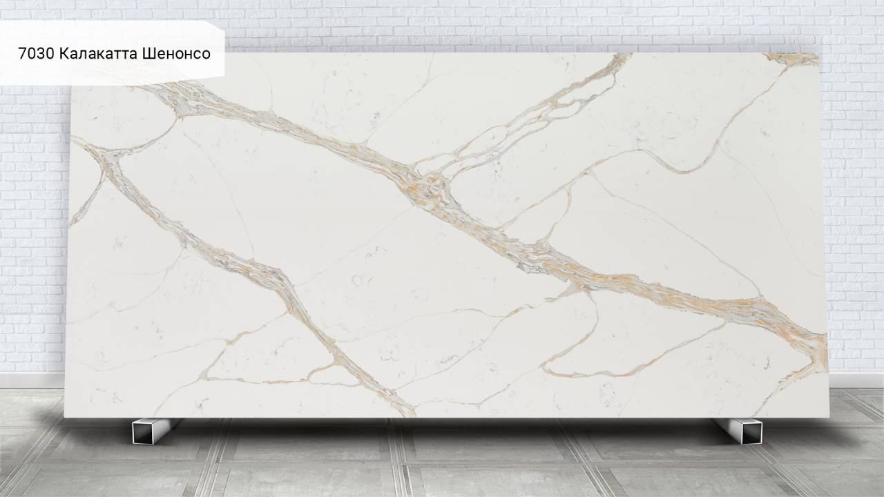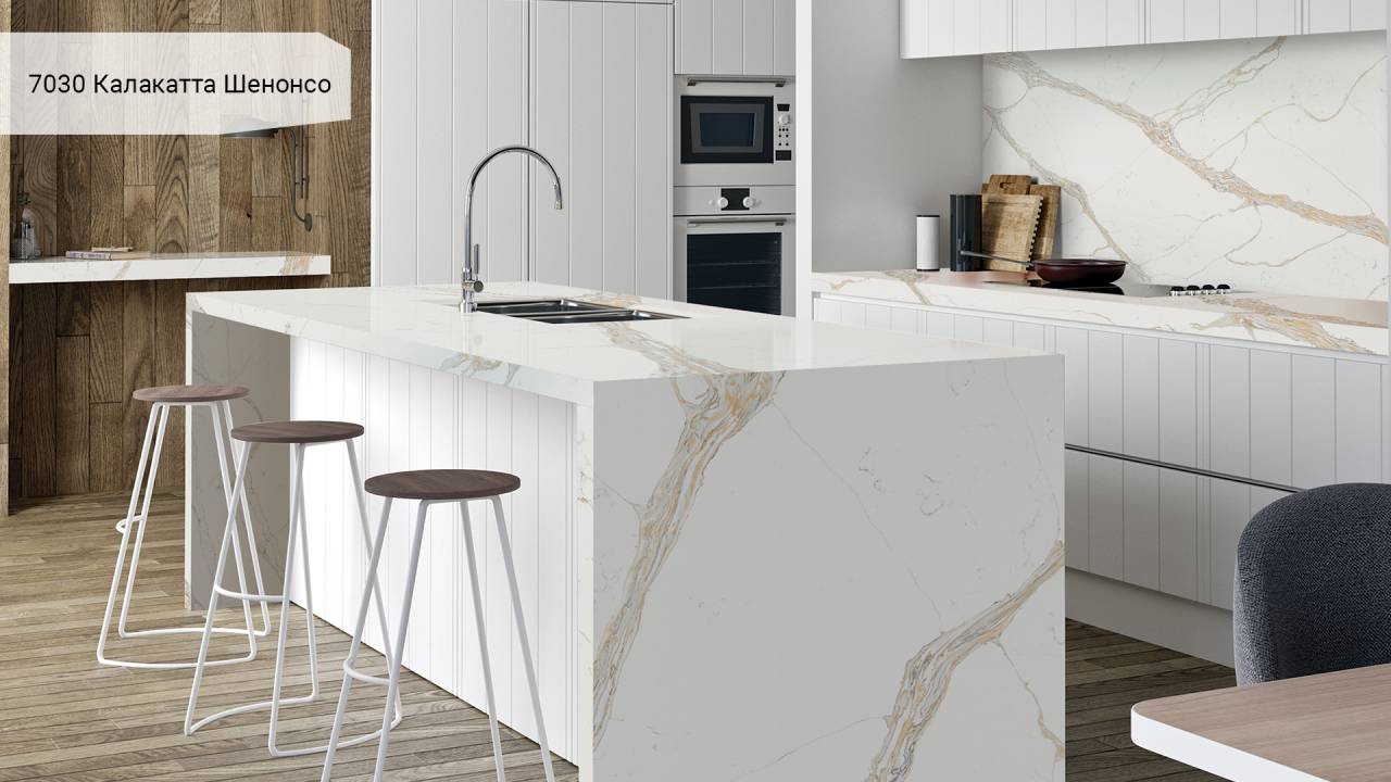 Кварцевый агломерат Avant Quartz 7030 Калакатта Шенонсо — белый с изысканными мраморными прожилками. Материал на 93% состоит из природного кварца, что обеспечивает исключительную твёрдость и долговечность поверхности.