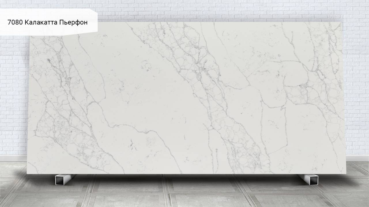 Кварцевый агломерат Avant Quartz 7080 Калакатта Пьерфон — белый с изысканными мраморными прожилками. Материал на 93% состоит из природного кварца, что обеспечивает исключительную твёрдость и долговечность поверхности.