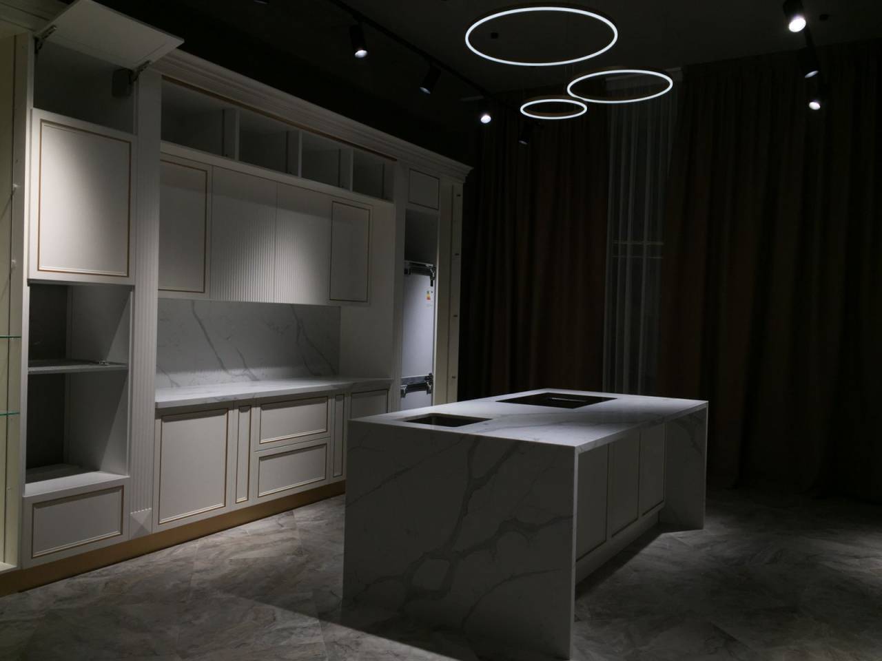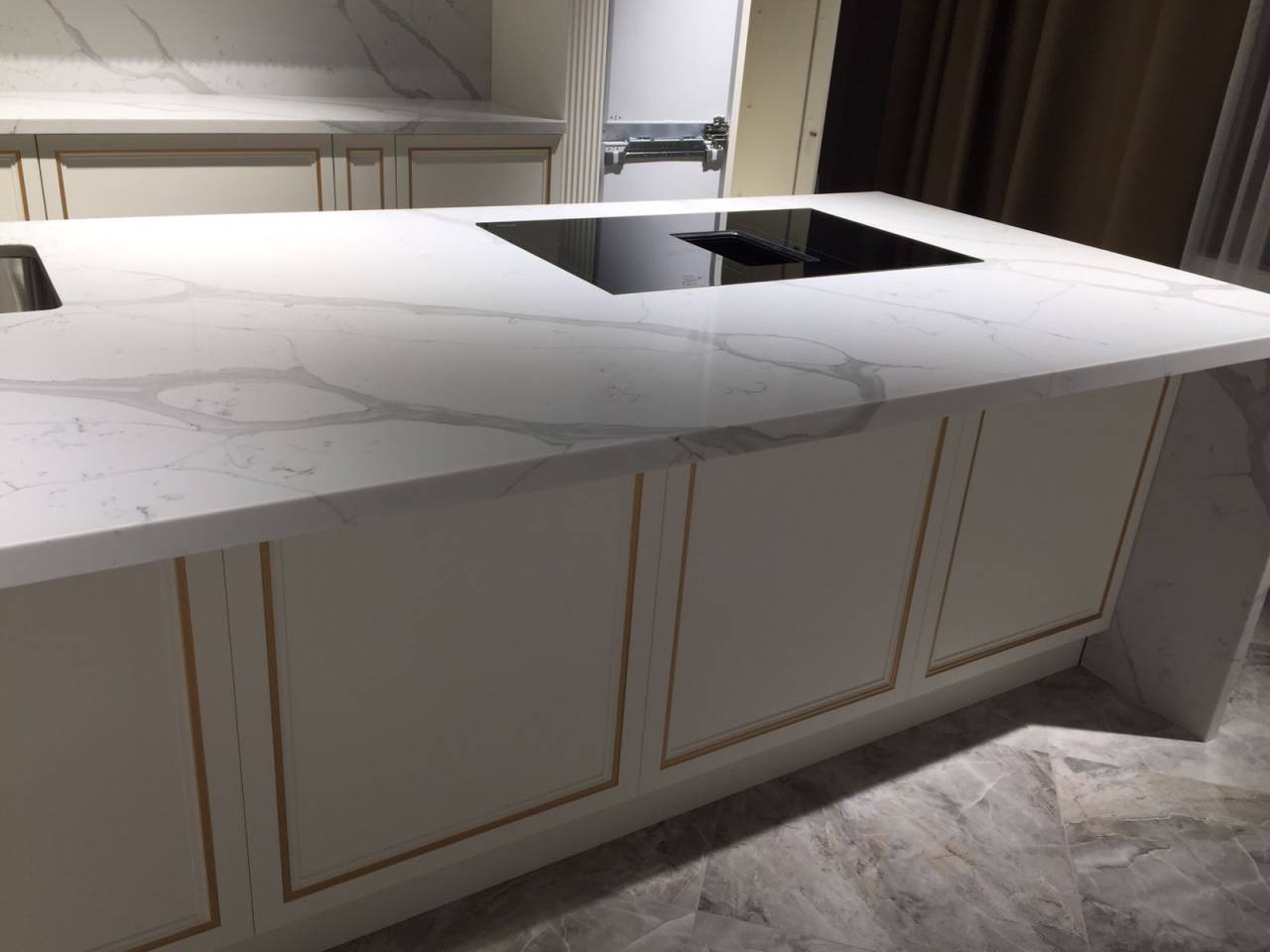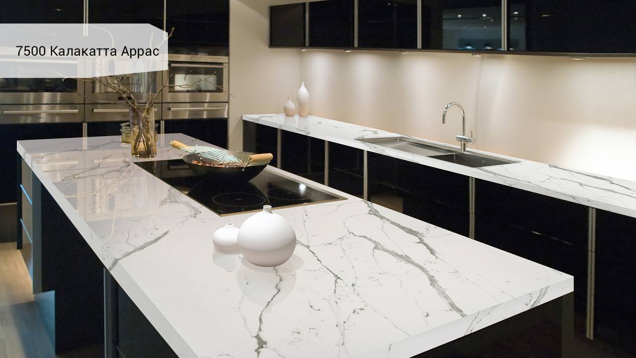 Кварцевый агломерат Avant Quartz 7500 Калакатта Аррас — белый с изысканными мраморными прожилками. Материал на 93% состоит из природного кварца, что обеспечивает исключительную твёрдость и долговечность поверхности.