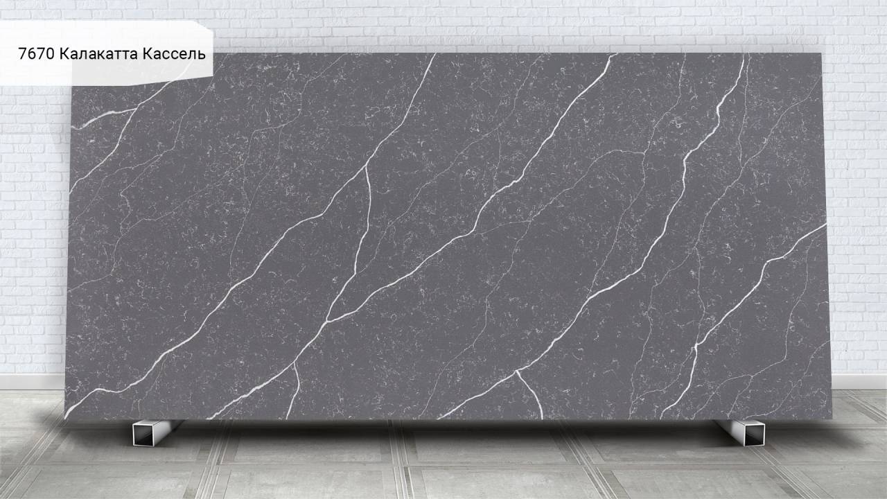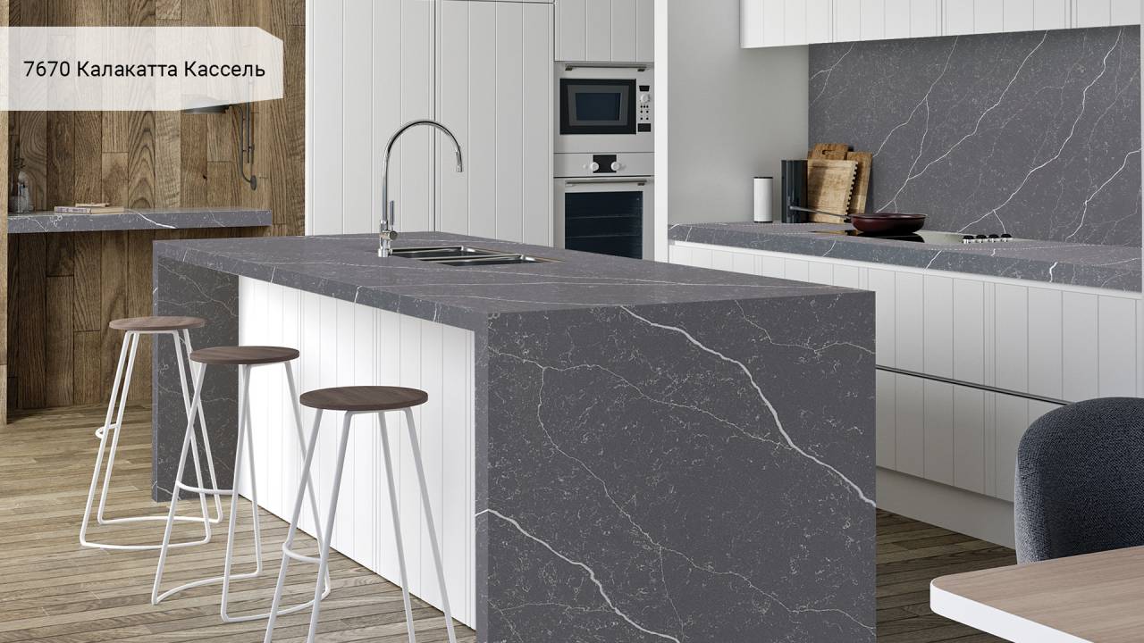 Кварцевый агломерат Avant Quartz 7670 Калакатта Кассель — белый с изысканными мраморными прожилками. Материал на 93% состоит из природного кварца, что обеспечивает исключительную твёрдость и долговечность поверхности.