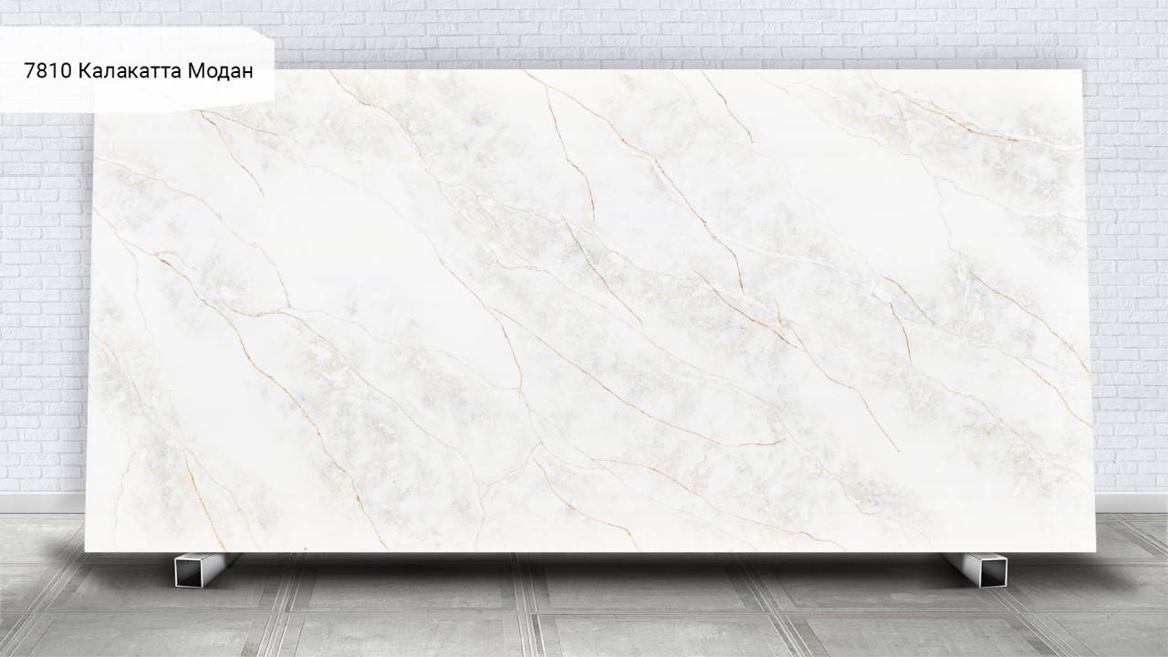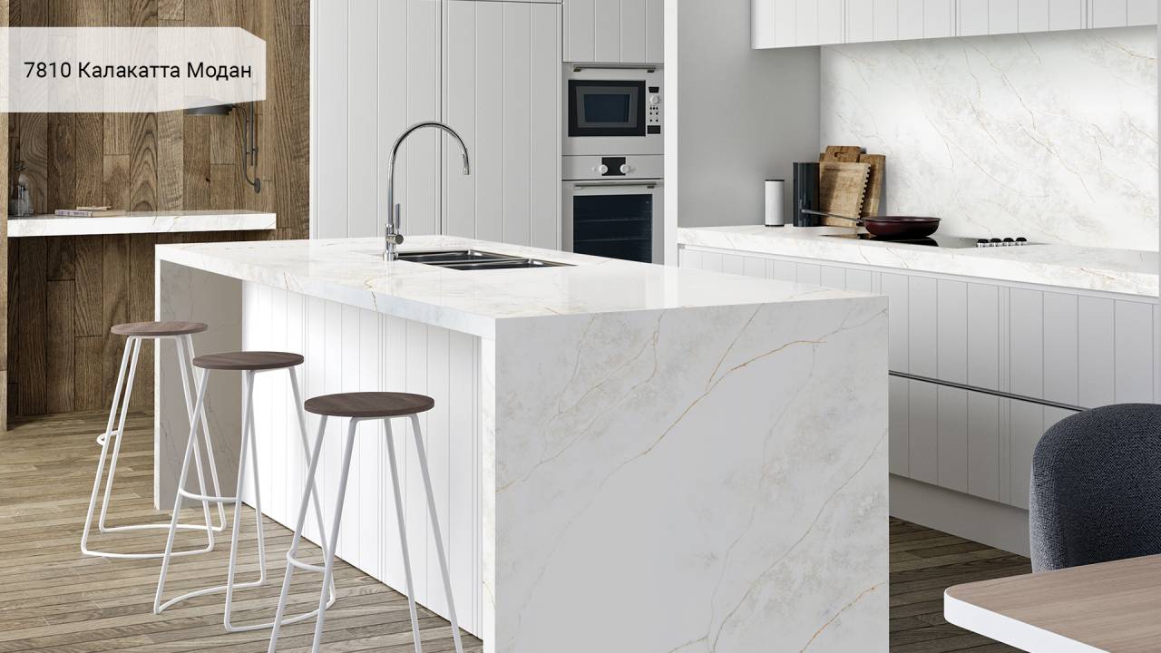 Кварцевый агломерат Avant Quartz 7810 Калакатта Модан — белый с изысканными мраморными прожилками. Материал на 93% состоит из природного кварца, что обеспечивает исключительную твёрдость и долговечность поверхности.