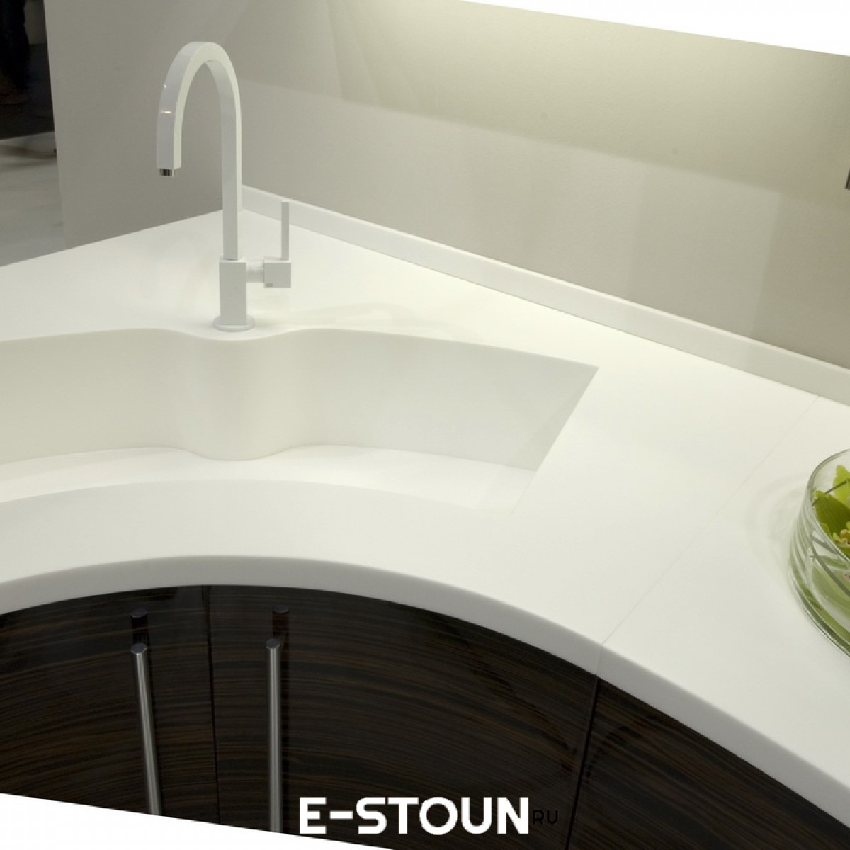 - Акриловой камень. Благодаря низким показателям пористости он не впитывает запахов и не окрашивается при контакте с продуктами питания. Очень прочный.