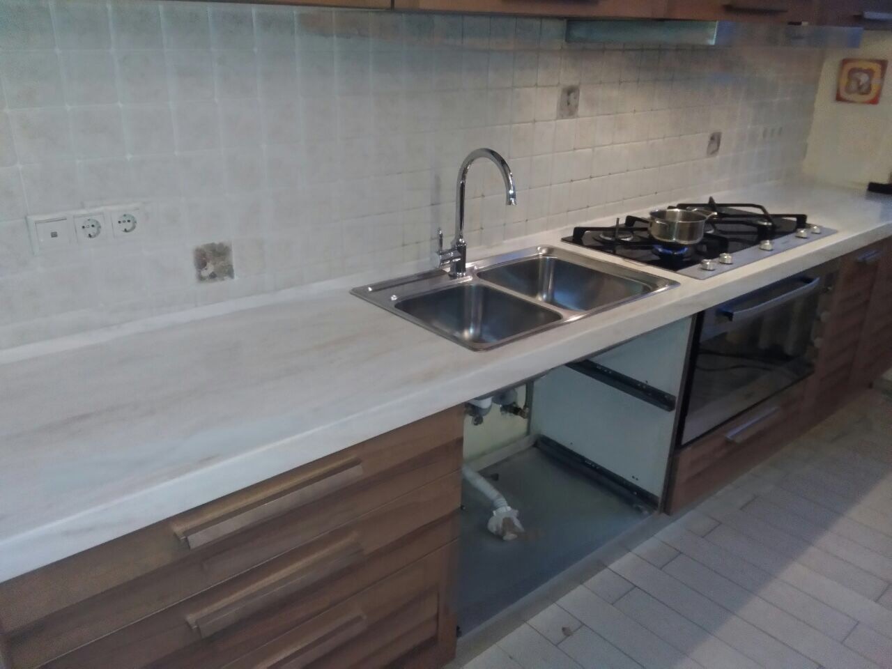 Столешница из искусственного камня с интегрированным подоконником - это красиво и удобно! Фотографии и видео готовой столешницы из камня Tristone F122 Chestnut. Цена 89 700 руб.