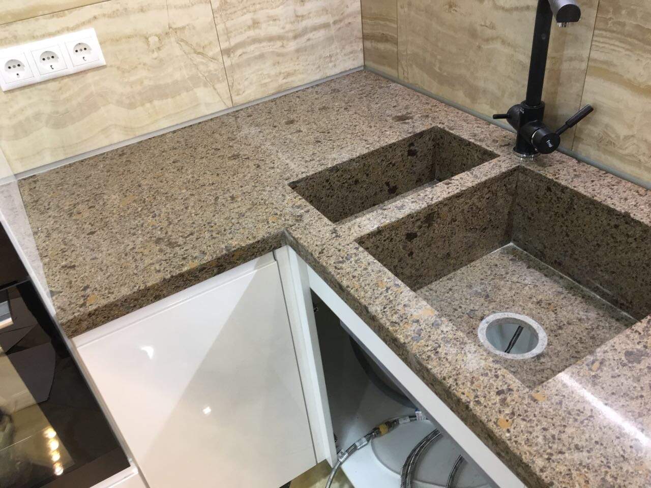 Это отчет с монтажа столешницы и барной стойки из камня. Столешница здесь стандартная: Г-образная с варочной панелью и накладной мойкой. Но необычная барная стойка: она стоит на ноге из камня, в которой сделаны вырезы по чертежу заказчика.