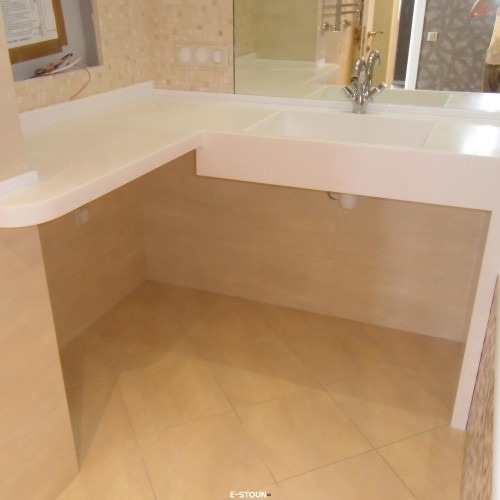 Данная столешница выполненна из чисто белого камня LG Hi-macs Perna White. Обратите внимание на то, что толщина столешницы справа и слева разная. Справой стороны столешницы сделанна толщиной 150 мм для того, чтобы закрыть сифон и обвязку раковины. Слевой же стороны планируется установка стиральной машинки, поэтому там такую толщину сделать невозможно: столешница поднялась бы слишком высоко.