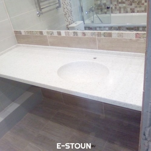 Это коротенький фотоочет с монтажа столешницы в ванную комнату из искусственного камня Grandex J505 Pearl Necklace. В данном заказе мы изготовили и установили интегрированную (литую) раковину из искусственного камня.