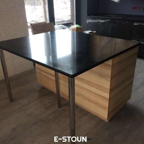 Данная столешница на остров выполненна с большим нависанием (600 мм), т.к. хозяин хотел, чтобы она выполняла функции полноценного обеденного стола для всей семьи. Но при этом хозяин переживал за прочность конструкции: в семье есть маленькие дети и были опасения, что дети, ухватившись за край столешницы, могут сломать ее. Поэтому были установленны 3 барные ноги. Хотя, по большому счету, и 2-х ног было достаточно.