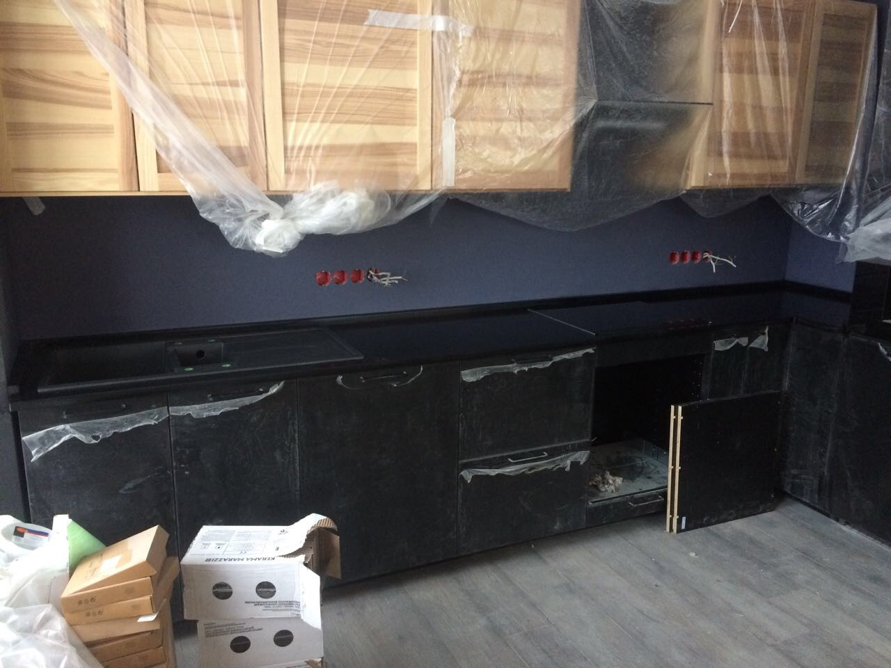 Это, вобщем-то, стандартный внешний вид кухни перед началом монтажа. Хотелось бы только отметить предусмотрительность хозяев: они не стали срывать защитные пленочки с фасадов сразу после установки, а благоразумно оставили их до окончания монтажа. Также должен сказать, что данная кухня заказанна в ИКЕЕ, но выглядит при этом хорошо.